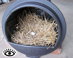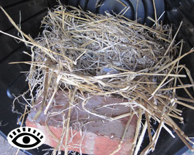 - Loosely pack straw into the bin to the height of the brick. Slightly flatten the straw in the centre to create the nesting hollow. To encourage the hens to lay there I place a fake egg in the centre of this hollow.