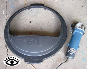 Rubbish bin lid with entrance section cut out. I used a grinder to cut the lid but a sharp knife should do the job.